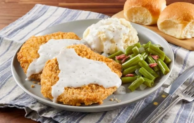 Hand-breaded and smothered in creamy country gravy Served with mashed potatoes and green beans (or your choice of sides)
